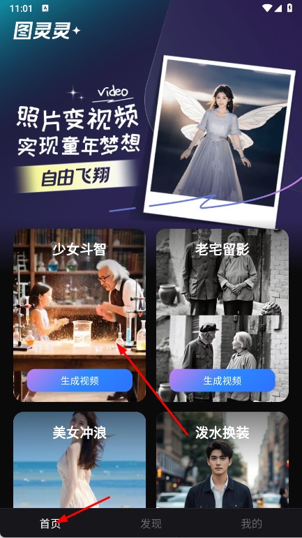 2、也可以点击底部发现,在分类,如老照片动起来,娱乐搞笑中挑选喜欢的风格案例,获取创作灵感。