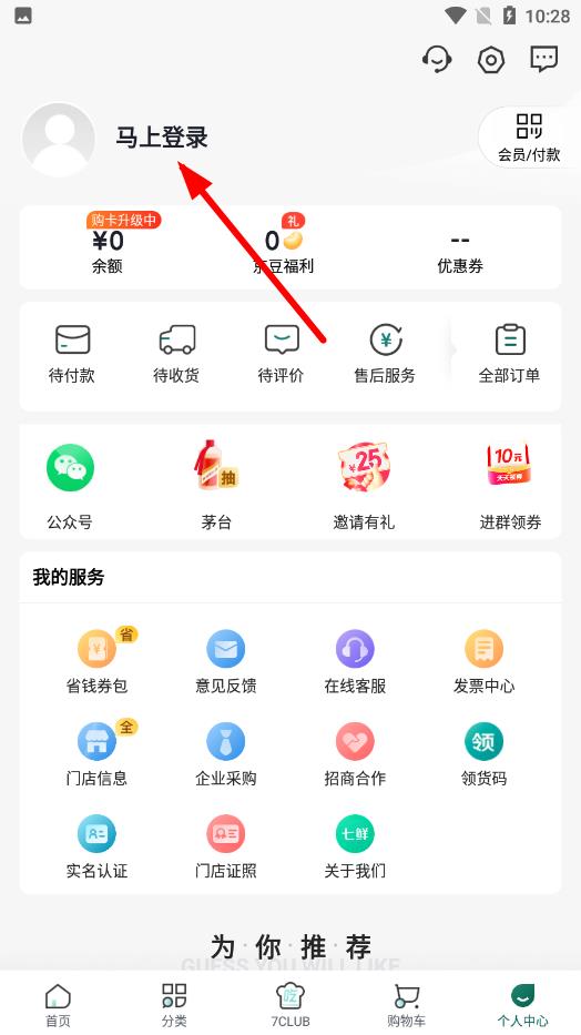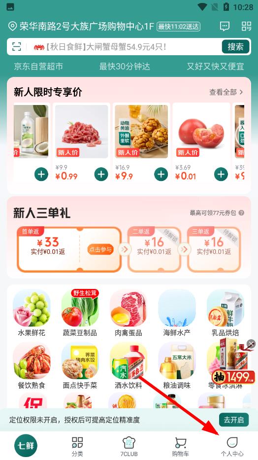 1、进入七鲜生鲜超市app主界面,找到底部导航栏最右侧的个人中心按钮,点击进入个人中心页面。