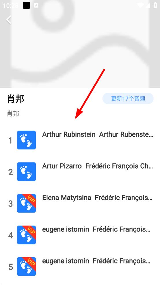 3、进入音频列表页面后,可看到不同演奏者演绎的肖邦音乐,点击想要播放的音频,即可开始进行胎教音乐播放。
