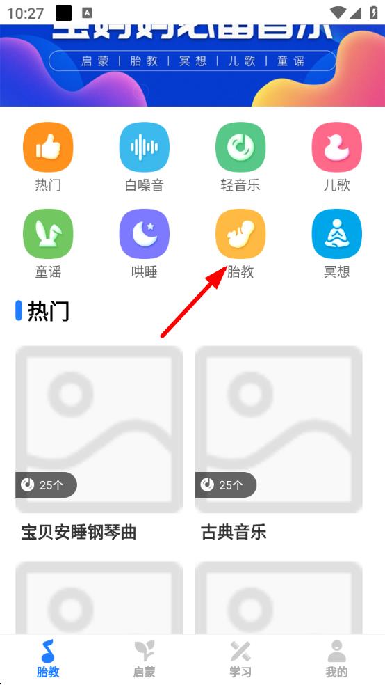 1、打开胎教启蒙软件,在主界面找到并点击胎教图标,进入胎教音乐分类页面。