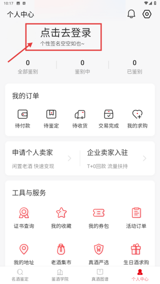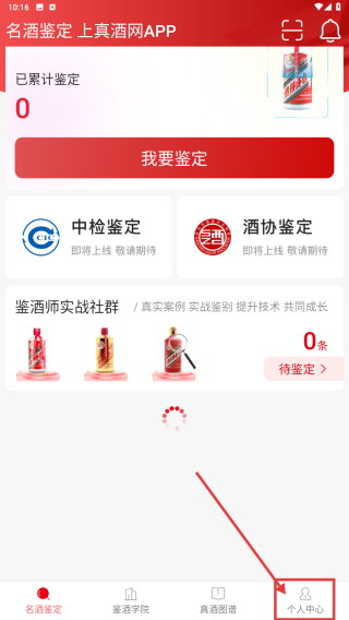 1、打开上真酒网APP,点击底部个人中心选项,进入个人中心页面。