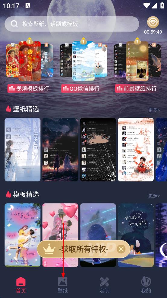 1、打开壁纸软件,进入主界面后,点击底部“壁纸”选项,进入壁纸选择页面,在众多壁纸分类中,找到“免费”分类并点击进入。