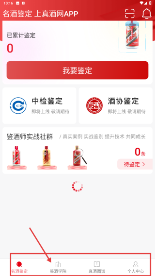 1、打开上真酒网APP,点击底部鉴酒学院选项,进入鉴酒学院页面。