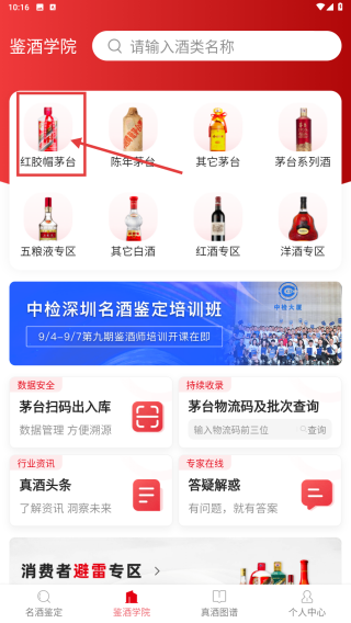 2、在鉴酒学院页面,点击红胶帽茅台分类,进入红胶帽茅台相关内容界面。