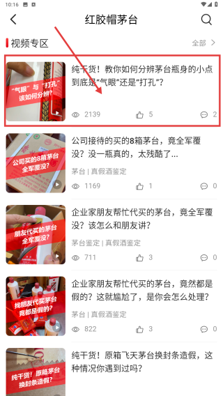3、在红胶帽茅台相关内容界面,查看该鉴酒教学视频。