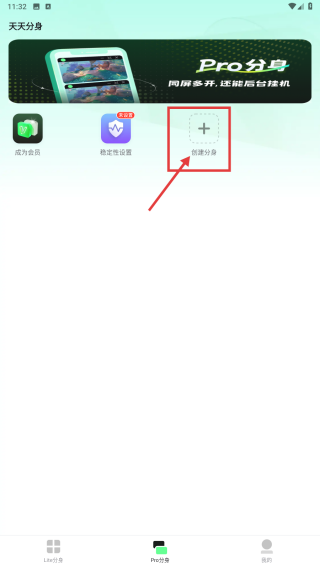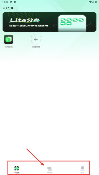1、打开天天分身应用,点击底部Pro分身选项,进入Pro分身页面。