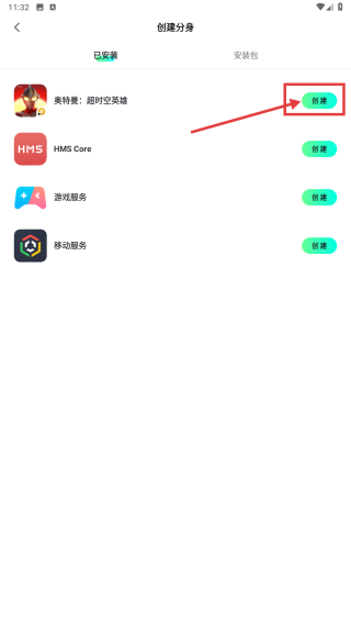 3、在创建分身界面,点击奥特曼:超时空英雄右侧的创建按钮,开始创建该应用的分身。