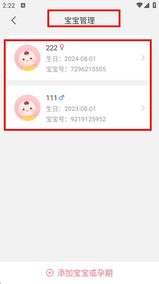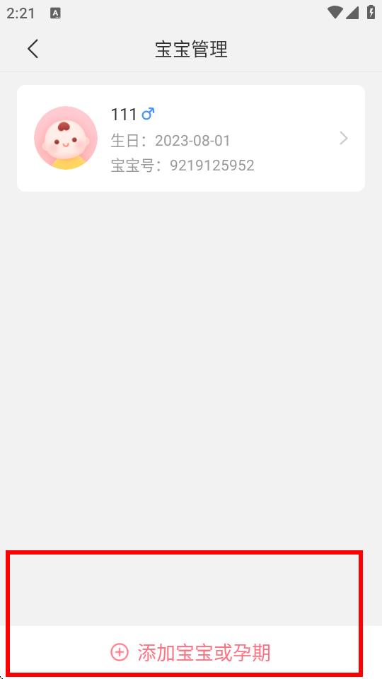 3、进入宝宝管理页面后,点击下方添加宝宝或孕期。