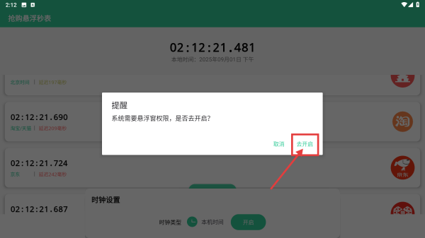 2、在时钟设置弹窗中,点击开启按钮,触发系统悬浮权限提示弹窗。