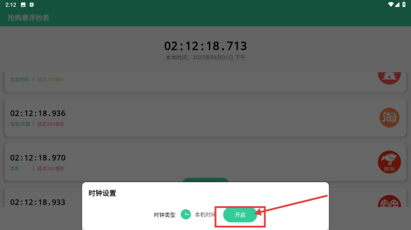 1、打开抢购悬浮秒表应用,点击页面中的开始按钮,弹出时钟设置弹窗。