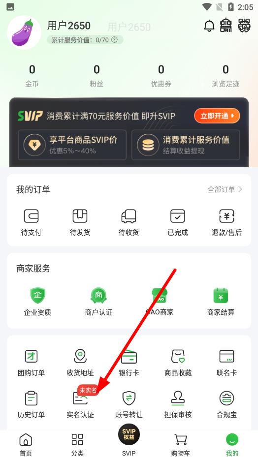 2、在我的页面中下滑找到实名认证选项,点击进入实名认证界面。