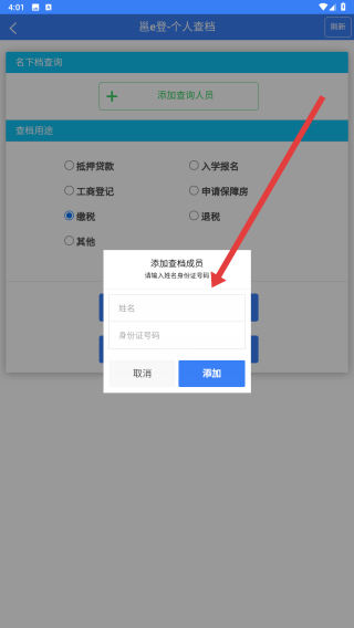 3、弹出添加查档成员窗口后,可以在输入框中输入姓名和身份证号码等信息后,添加查档人员。