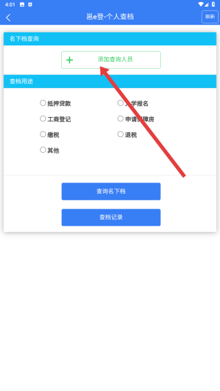 2、在跳转到个人查档页面中,在下方选择查档用途后,点击添加查询人员按钮。