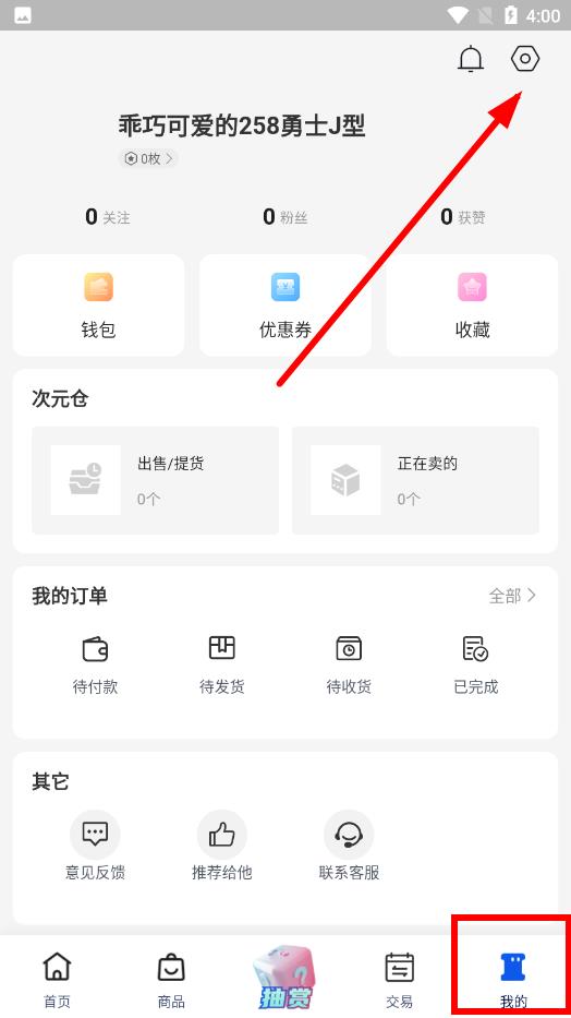 1、打开造物app,进入界面后点击底部导航栏最右侧我的选项,在我的页面中,点击页面右上角类的设置图标。