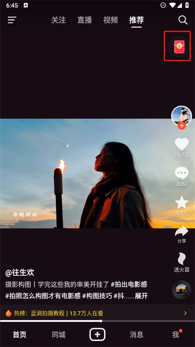 1、进入软件后我们可以看到有个红包一样的图标,看视频会一直转圈进入这里查看金币;