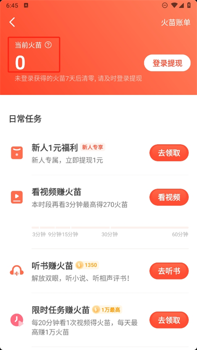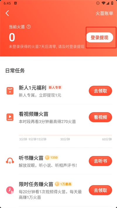 4、接着我们如果有足够多的火苗可以直接在这里进行提现,前提是提现需要登录一定要不登录火苗会清零哦。