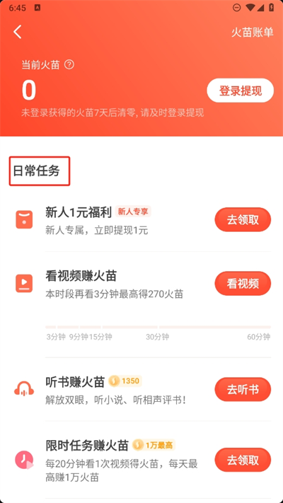 3、在这里可以看到日常的一些任务,这些任务完成后会获得超多的火苗奖励需要坚持做下去;