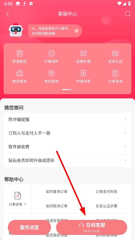 3、在客服中心页面下方的帮助中心板块,找到并点击在线客服按钮,即可在线客服取得联系咨询问题。