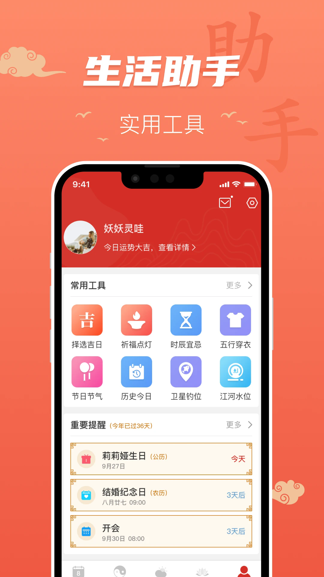 1、日历:农历、节日节气、放假信息、每日运势、历史上今日发生的大事件、养生好文一目了然,让每天更有意义。