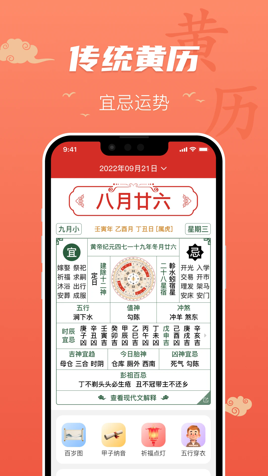 2、黄历:黄历宜忌、吉日查询、方位罗盘、五行冲煞(附现代文解释)...择吉必备,弘扬传统文化。