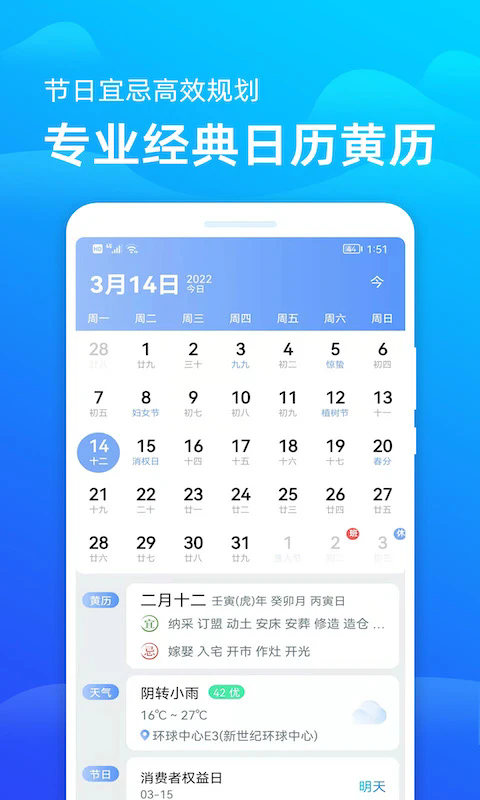 3、提供年视图跟月视图切换、黄历宜忌、节假日查询,详细全面的周历、月历信息。