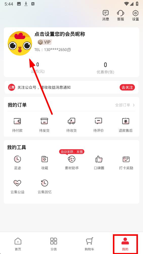 1、打开云集app点击底部导航栏中我的,进入个人相关界面后点击头像区域,进入个人信息界面。