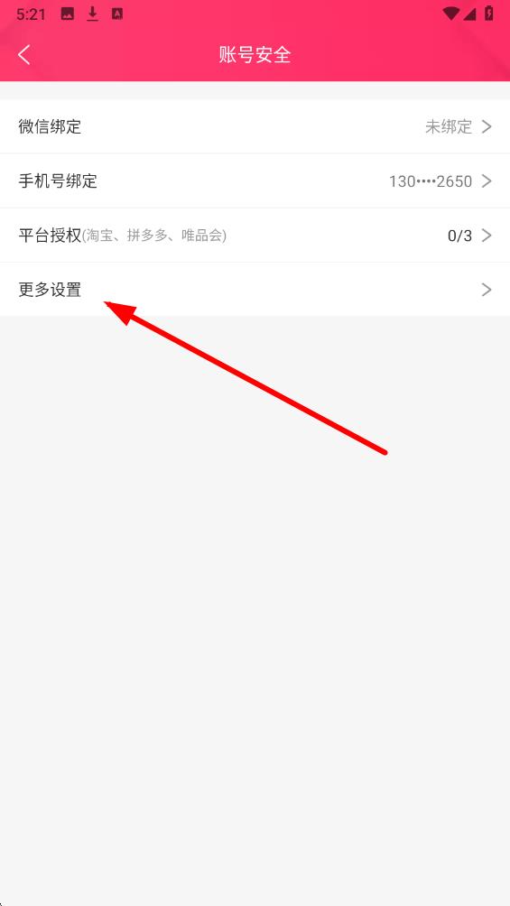 3、在账号安全页面里,点击更多设置选项,进入更多账号相关设置界面。