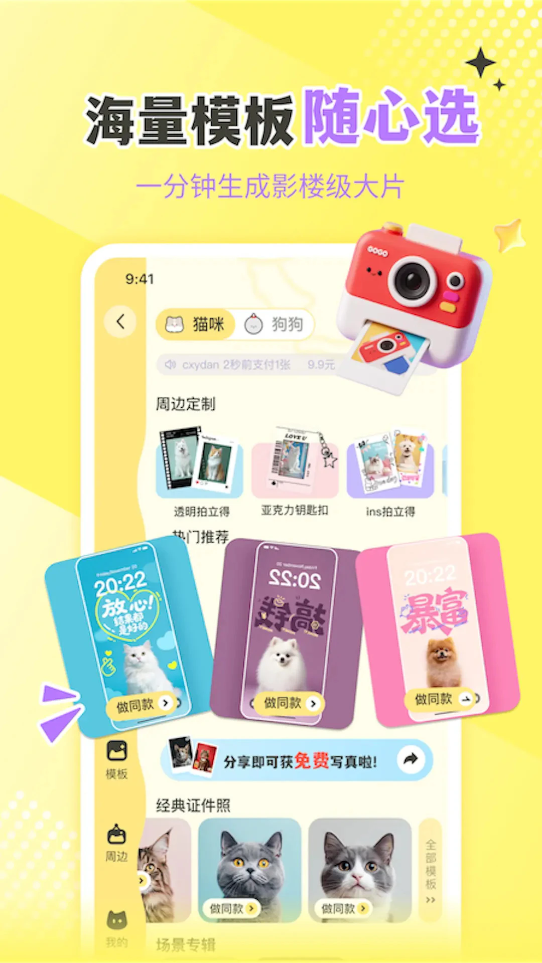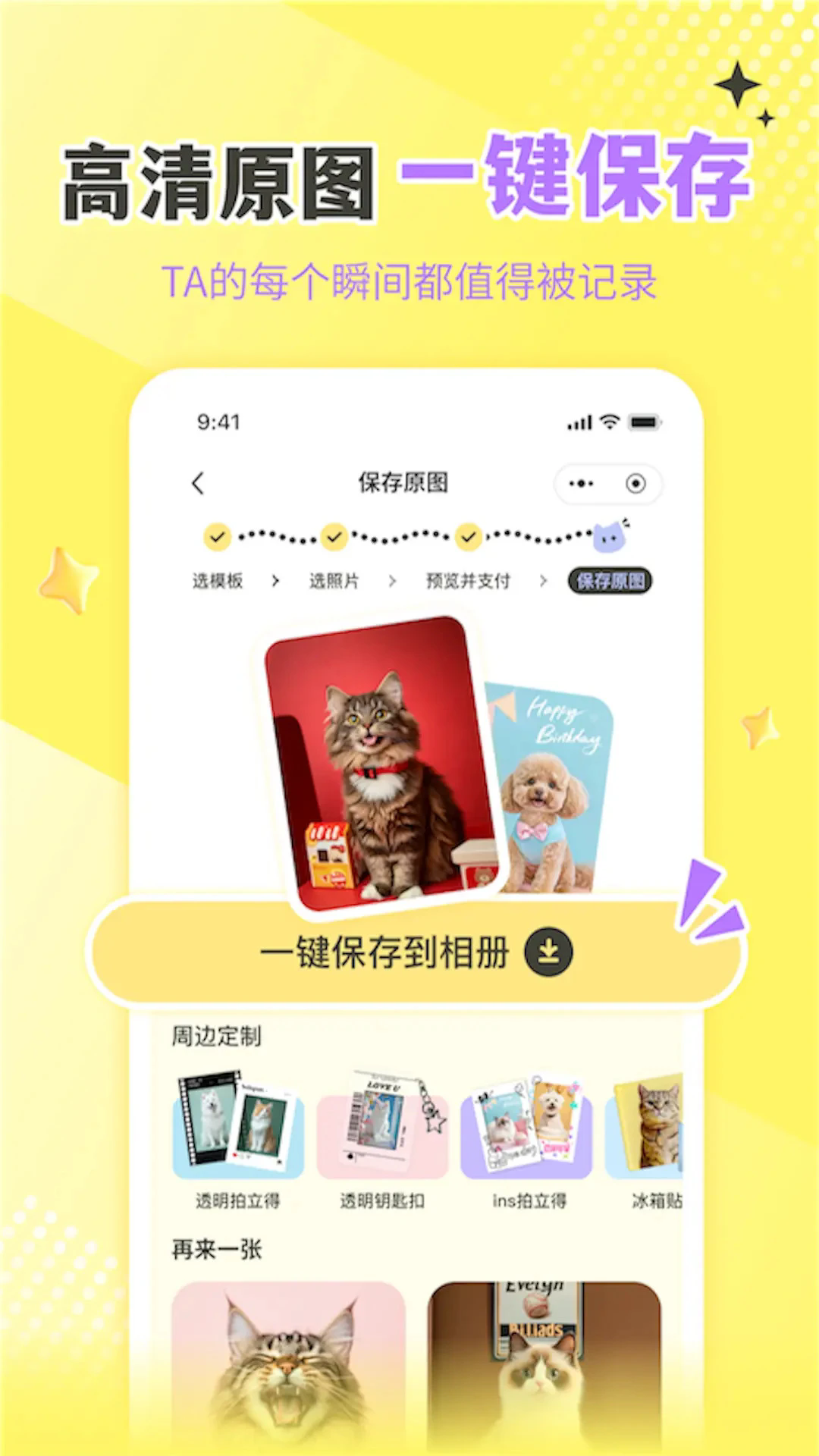 支持用户一键定制各种宠物周边,可以制作拍立得照片、钥匙扣、冰箱贴等;