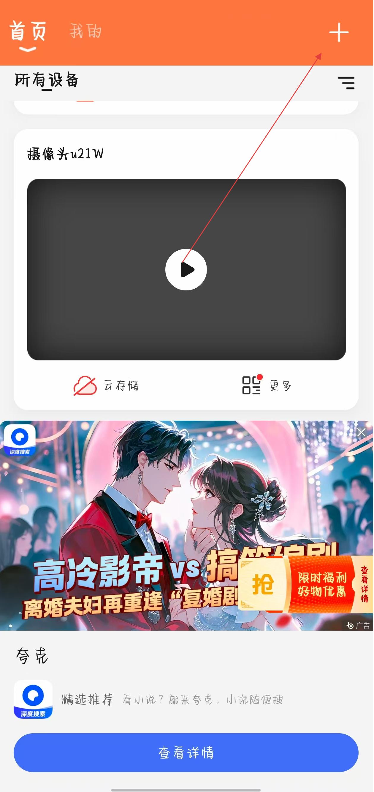 1、打开喵眼精灵应用,在首页右上角点击+号按钮,进入设备添加方式选择页面。