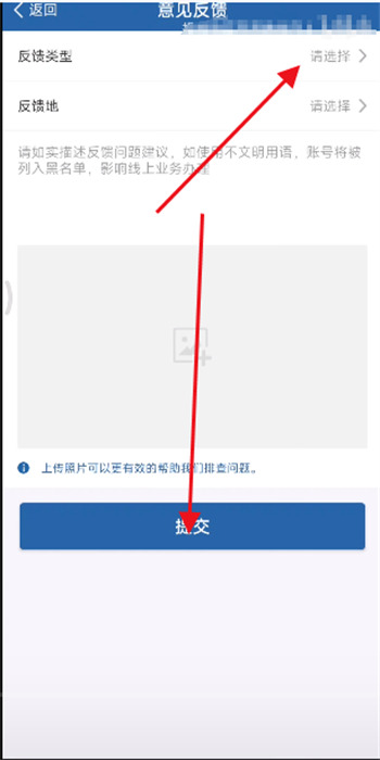 4、最后,只需要将反馈类型并上传照片,最后点击【提交】,在一定时间内会给出处理结果。