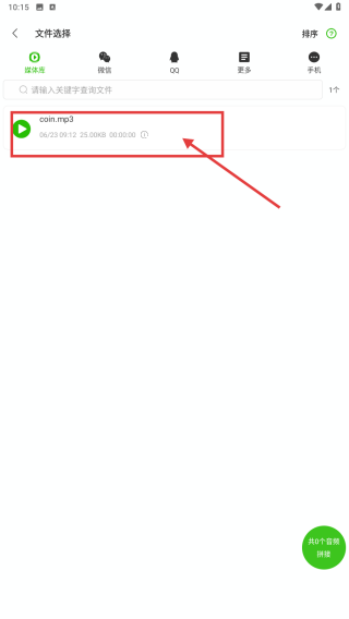 3、在文件选择界面,选择coin.mp3文件,准备进行音频拼接操作。