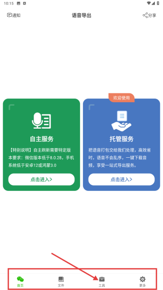 1、打开音频处理应用,点击底部工具选项,进入工具功能页面。