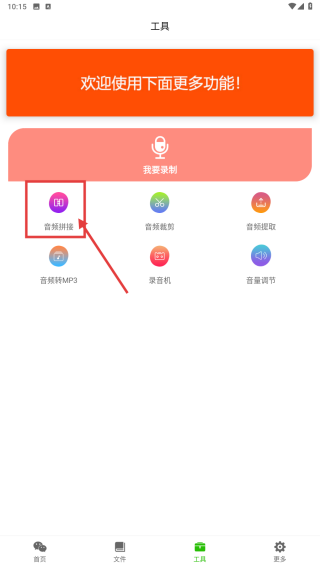 2、在工具页面,点击音频拼接功能图标,进入文件选择界面。