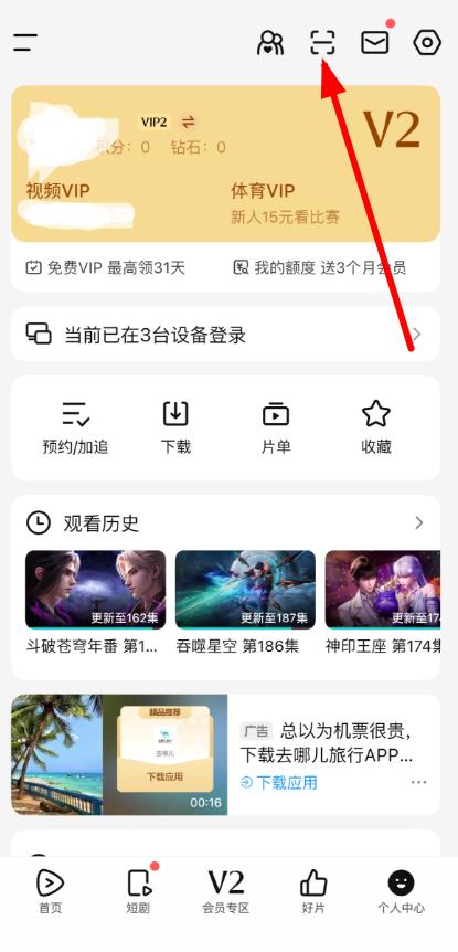 2、在个人中心页面,点击右上方类似扫一扫的图标。