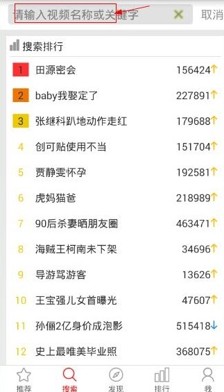 2、在主页的下面点击搜索,在下面是网上最新*抢手的新闻排行榜,在方框内输入您想看的视频