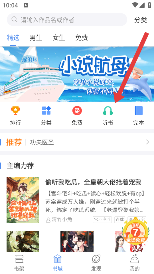 1、打开逐浪小说APP,进入书城页面,点击听书的选项,进入听书的专区。