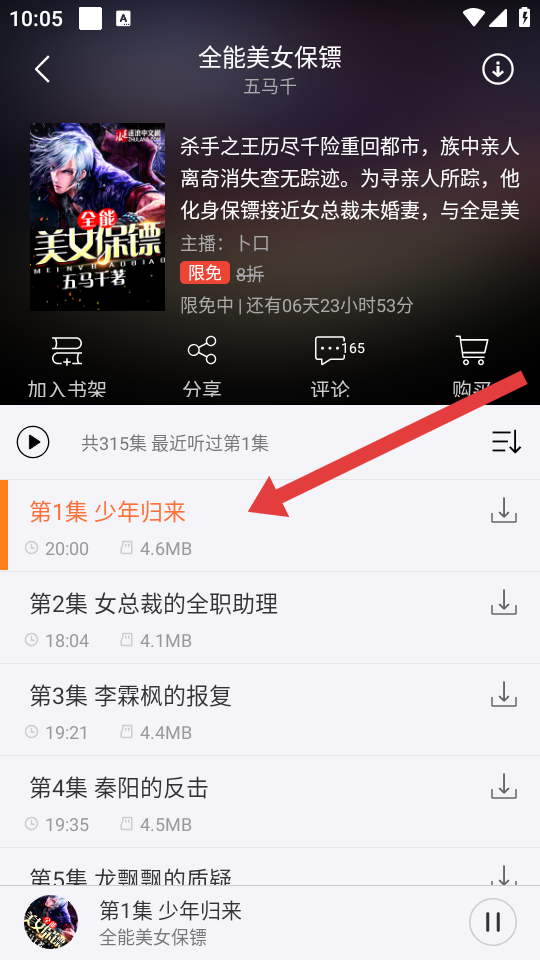 3、在书籍的听书详情页面,点击具体的集数如第1集少年归来,即可开始听书。