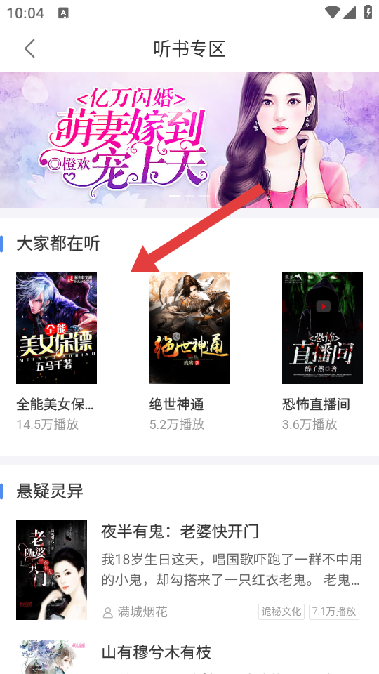 2、在听书专区中,选择想要听的书籍如全能美女保镖,点击进入该书籍的听书详情页面。