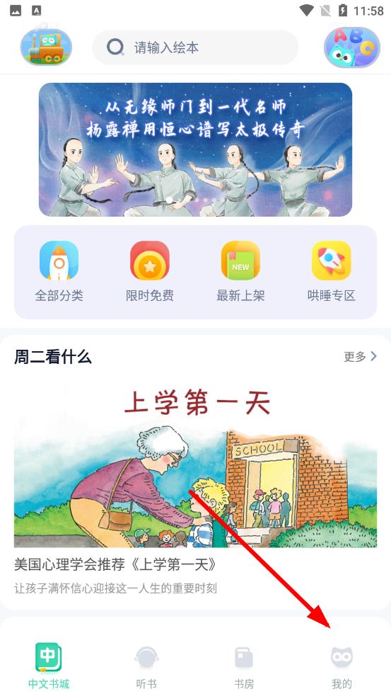 1、打开咿啦看书绘本故事app进入首页后,点击屏幕底部导航栏最右侧我的图标进入个人中心。