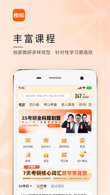 橙啦英语APP就是橙啦app专为考研打造的学习软件,众多资深名师通过直播形式,带来专业且深入的讲解,以清晰思路与独特方法,助力学子透彻理解知识要点。配套的学习资料全面且实用,无论是笔记总结,还是知识点梳理,都能让学习变得轻松便捷,为知识巩固提供坚实支撑。