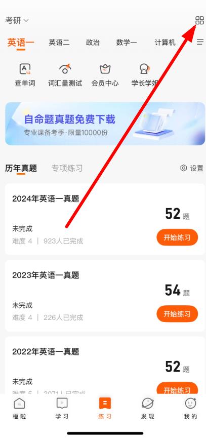1、打开橙啦APP,点击底部导航栏中的练习选项。