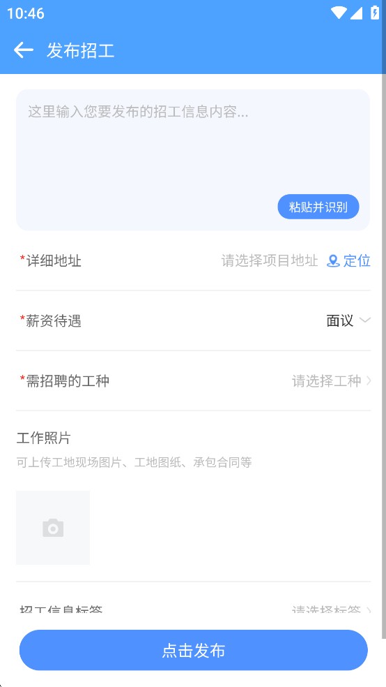 2、能够随时在此发布建筑招工的信息,可以在此直接编辑招工的文字内容;