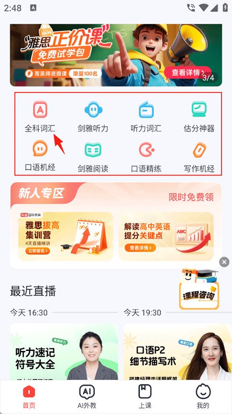 1、打开高途雅思官方版软件,点击首页-全科词汇。