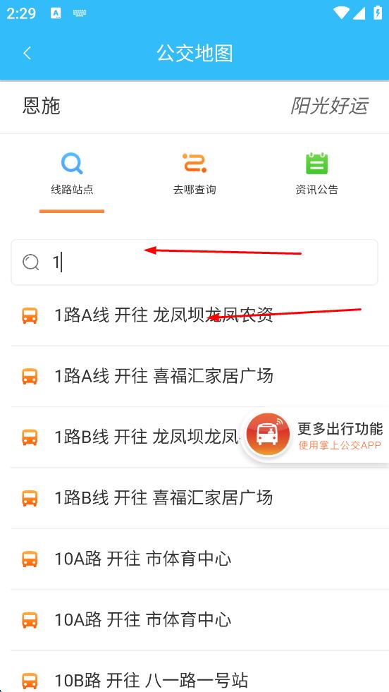 2、在公交地图页面的搜索栏中输入要查询的公交路线相关信息,比如输入需要查询的线路,下方会显示出相关的公交路线,挑选出自己需要的那一条。