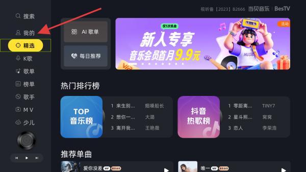 1、打开当贝酷狗音乐APP,进入到首页,在左侧菜单栏点击我的选项。