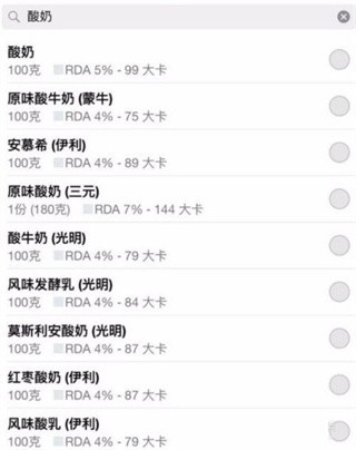 4、更神奇的是他可以比较各种不同牌子的相同产品的卡路里,让你一眼就看出最好的选择。比如酸奶,我们可以看出市面上的大多酸奶,蒙牛伊利三元等等,他们的卡路里都是差不多的,只有纯酸奶最健康。