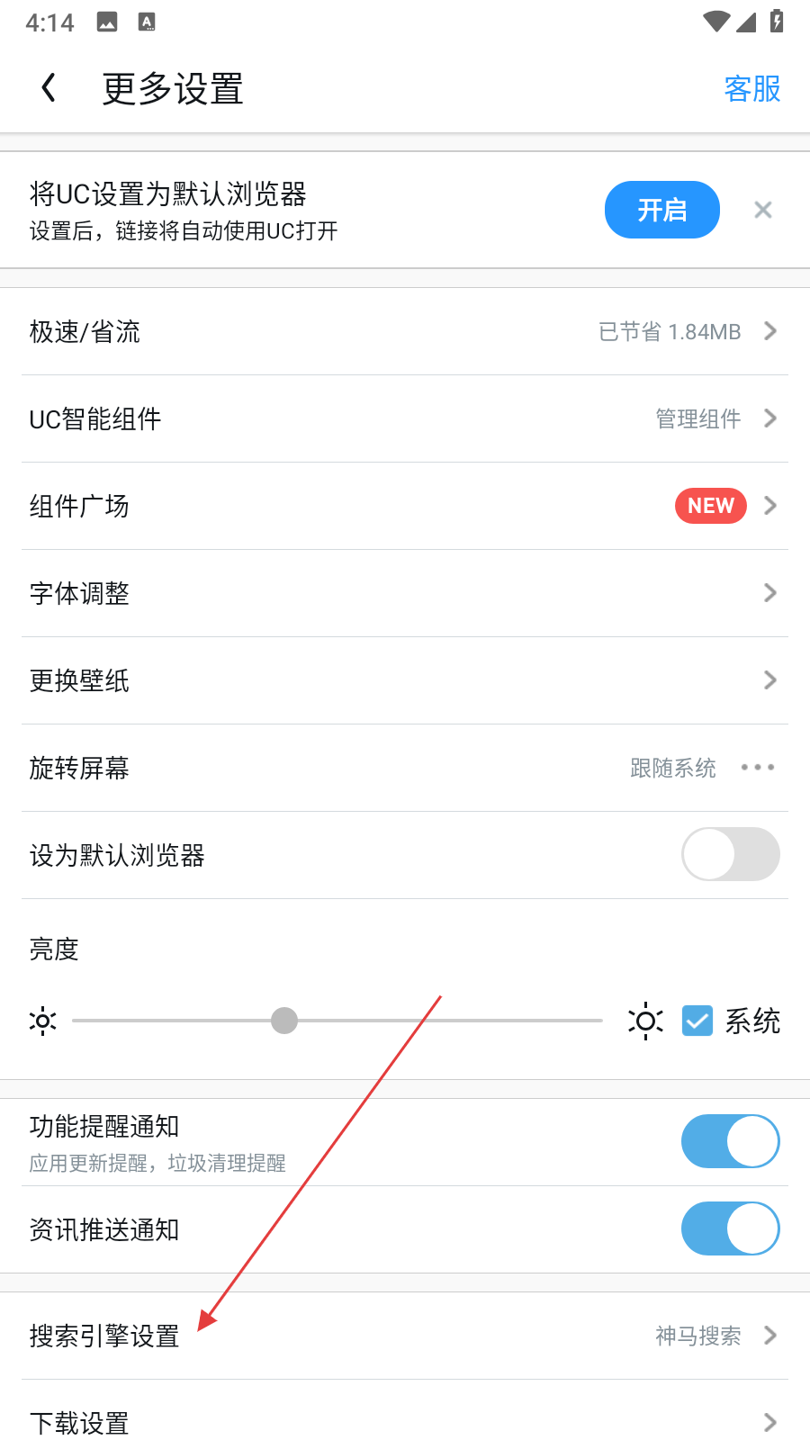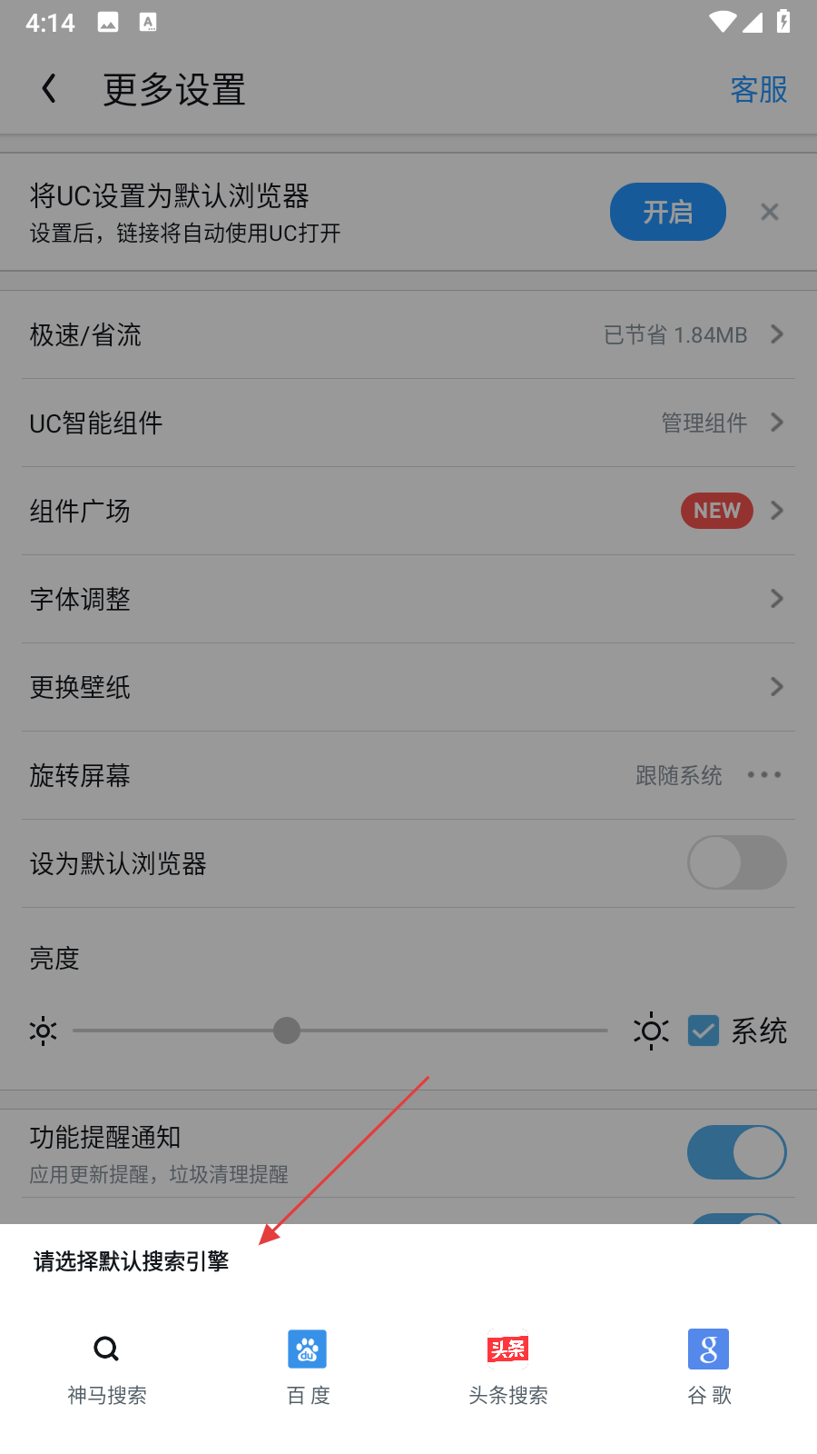 2、在更多设置页面中找到搜索引擎设置选项,点击该选项,弹出请选择默认搜索引擎列表。