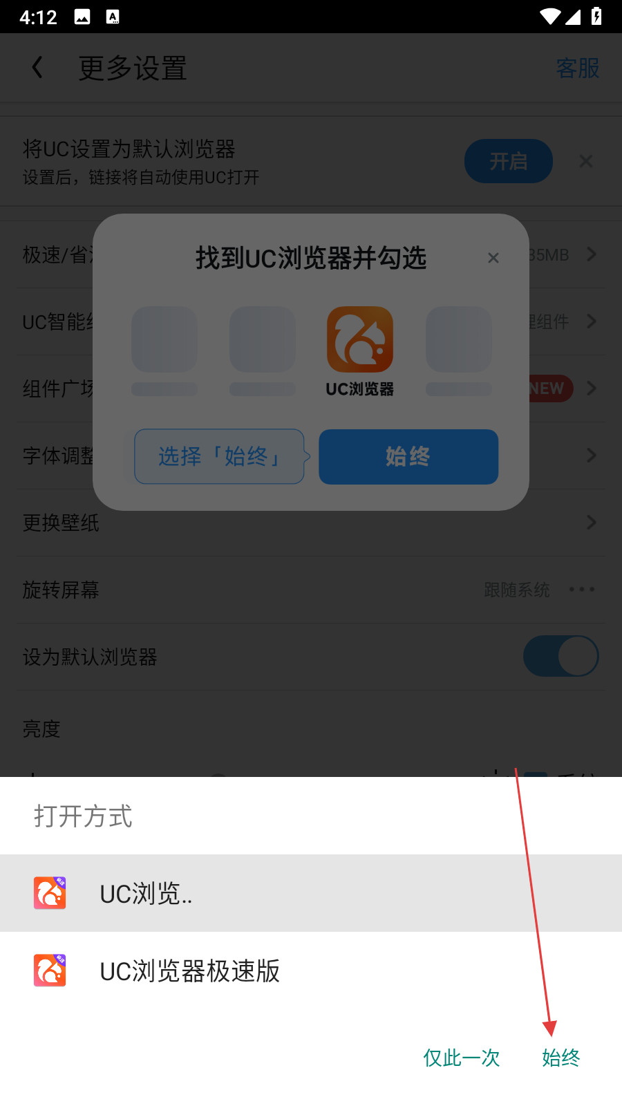3、在弹出的打开方式选择界面中,找到UC浏览器极速版,点击始终按钮,即可将UC浏览器极速版设为默认浏览器。