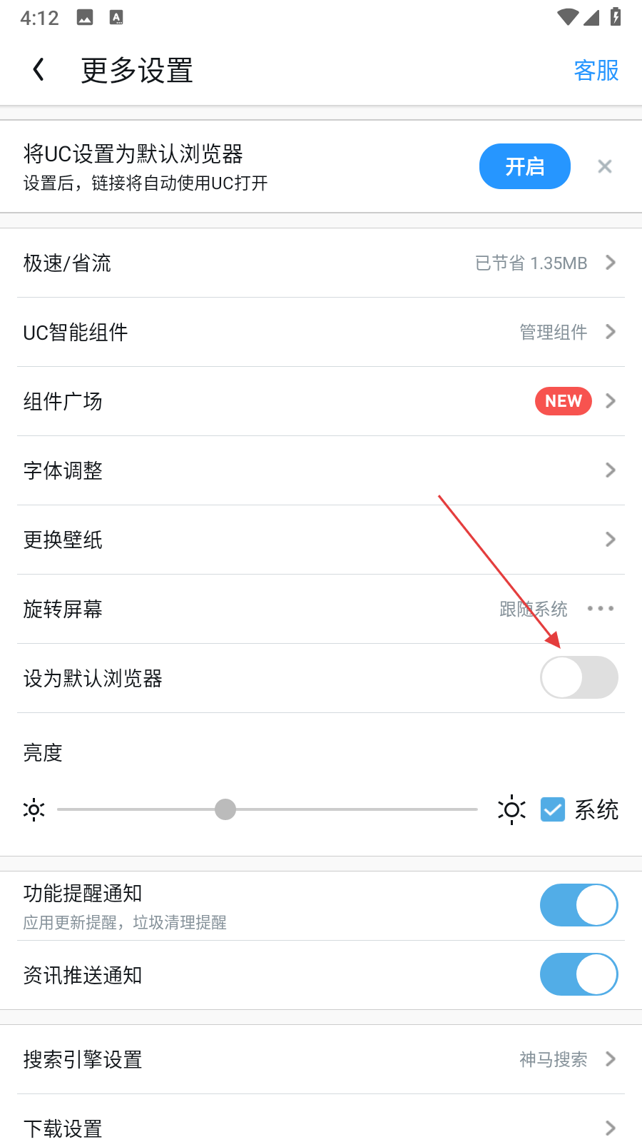 2、在更多设置页面中找到设为默认浏览器选项,点击其右侧开关按钮。