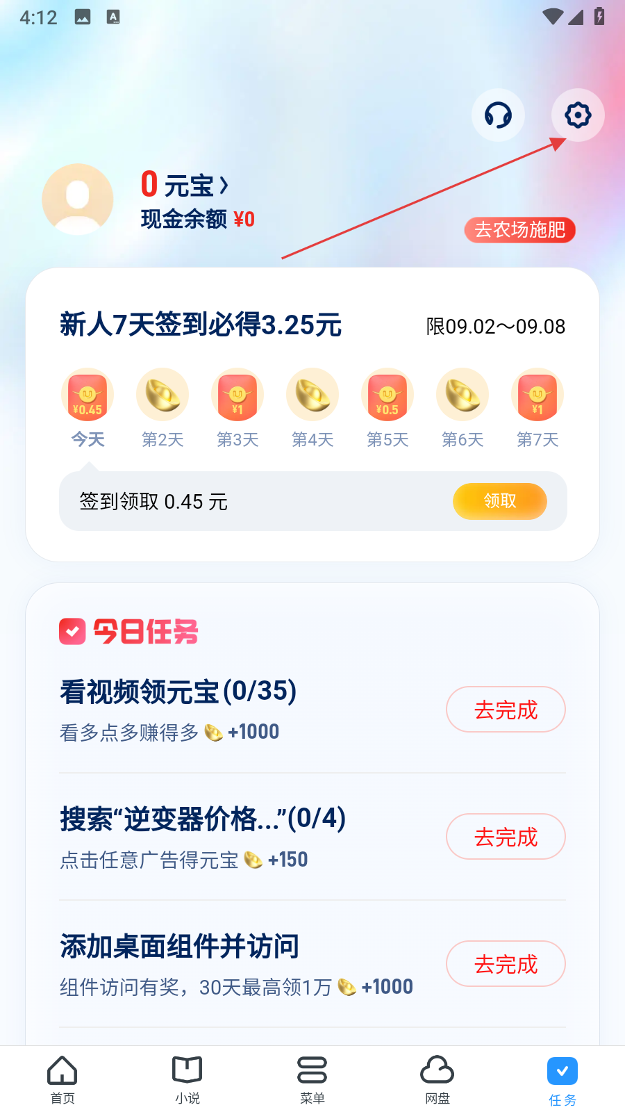 1、打开UC浏览器极速版,点击界面右上角齿轮状设置图标,进入更多设置页面。